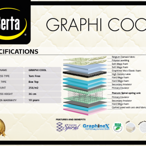 Manufactured using the latest technological innovation: Graphinex ! Graphi cool mattress is equipped with Graphinex infused Visco foam layer and natural latex layer in the top quilting panel to provide ultimate relaxation and comfort. It also has a layer of 60 D Graphinex Visco foam and 30 D mega foam layer apart from several layers of foam and insulation to provide additional comfort and breathability. The patented Posture spiral spring technolgy provides advance pressure relief and better support than a single coil design for a  cooler good night’s sleep.
